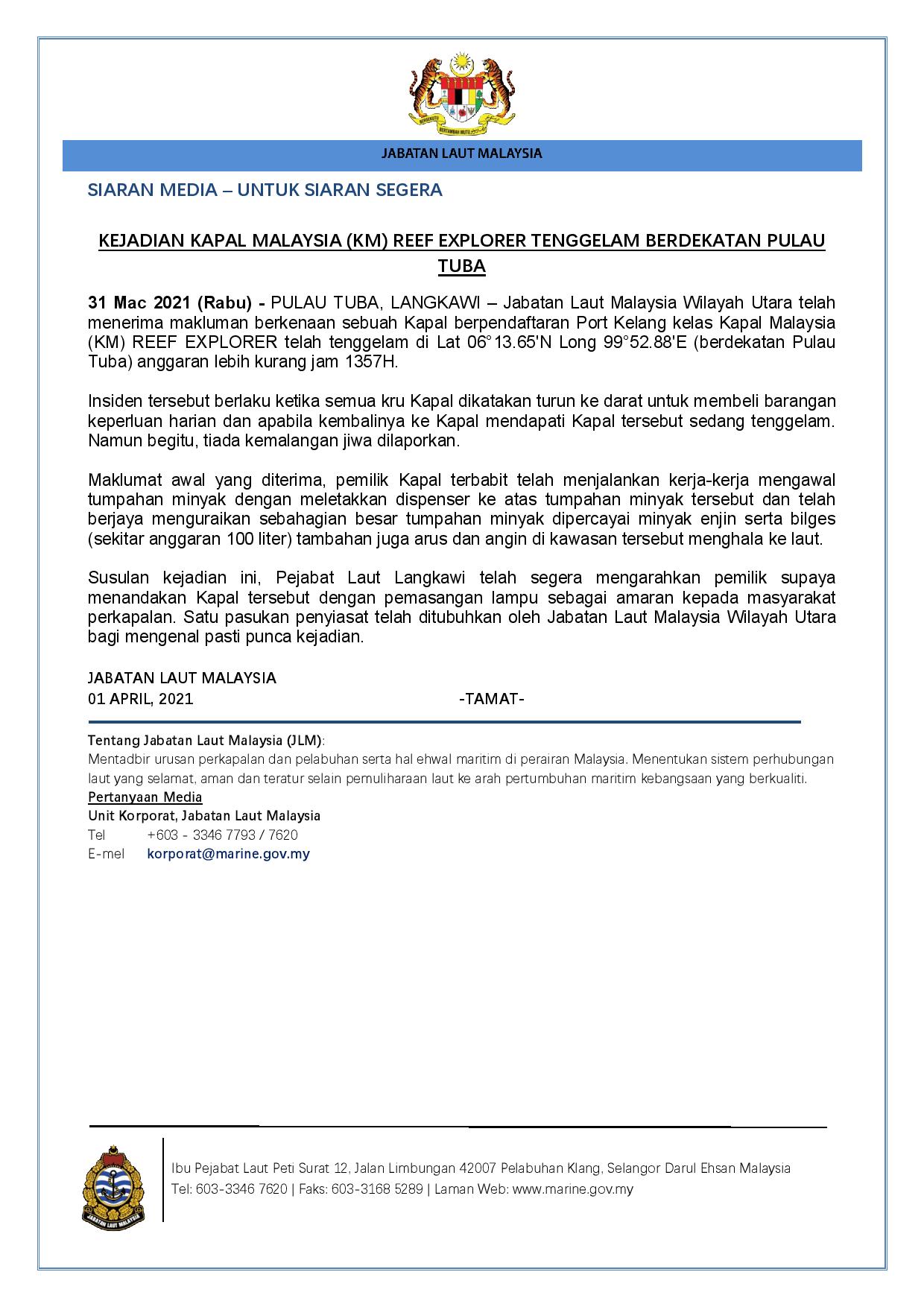 Jabatan Laut Malaysia On Twitter Siaran Media Jabatan Laut Malaysia Kejadian Kapal Malaysia Km Reef Explorer Tenggelam Berdekatan Pulau Tuba 31 Mac 2021 Baharinah Motmalaysia Https T Co Vrttvxihes Twitter